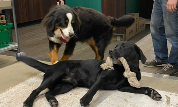 Wij zijn een 'beetje' hondengek. Met een Labrador, Stafford en Berner sennenhond hebben we regelmatig 3 enorme knuffeldieren rondlopen ter ondersteuning. Zo zorgen we dat we, naast energie van de koffie, ook kunnen ontspannen door te knuffelen met de honden.